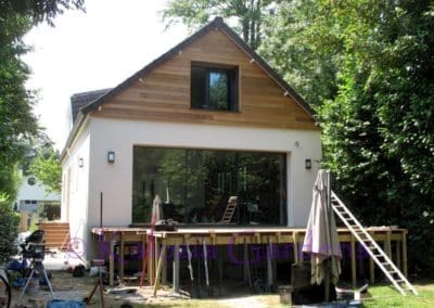 Terrasse en ipé attenante au salon dominant le jardin. 2ème comme suspendue à l’avant. Rangement avec porte, saturateur donnant l’effet mouillé